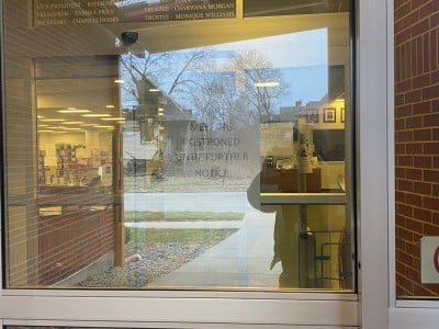 A notice posted on the library’s front door said the March 12 board meeting was “postponed until further notice.”