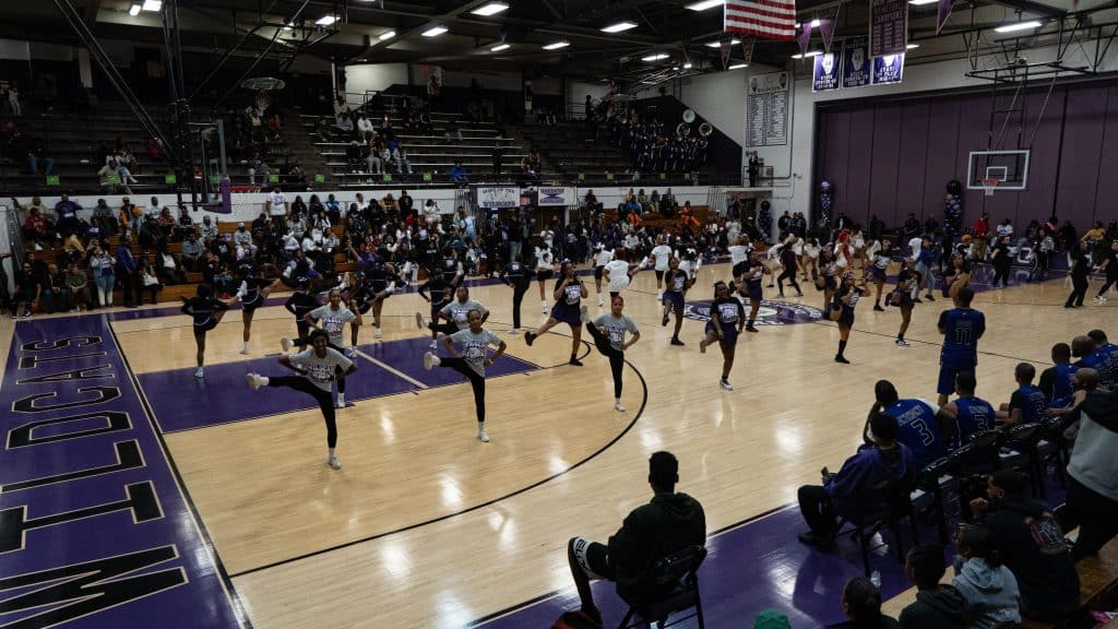 Purple, black, and gray balloons adorn Thornton’s gymnasium. Renowned hits such as The Jackson 5’s “I Want You Back” and Bell Biv Devoe’s “Poison” reverberate across the court. Ahead of the big game, a small dance party emerges in the middle as the room fills up with many more familiar faces.