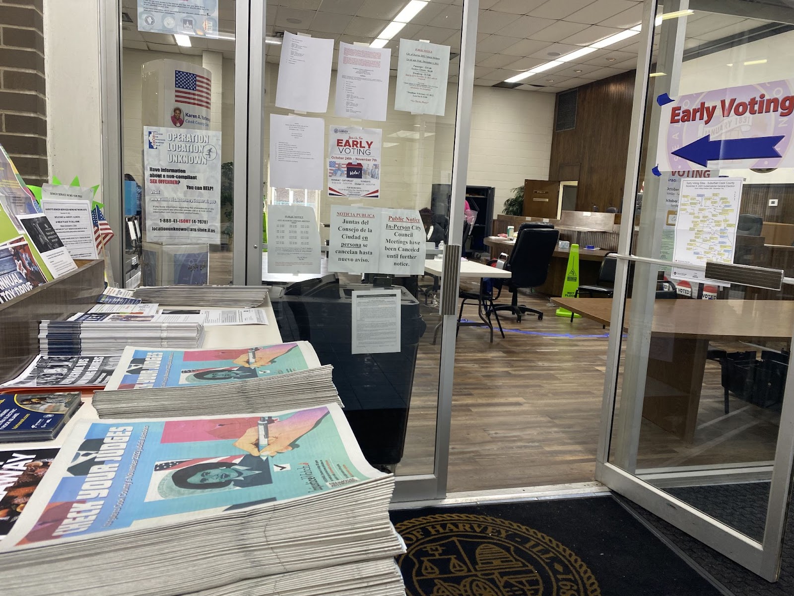 An exterior view of City Council chambers, as shown November 4, 2022. A public notice advises that in-person gatherings have been cancelled. HWH / Amethyst J. Davis