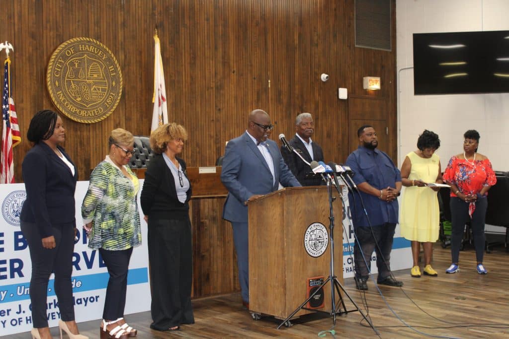 “Government doesn’t come first,” but rather the community does, he said. The “Hold the Tax” initiative will need Council approval, with budget season around the corner. Alderman Tyrone Rogers (6th) flanked the mayor and his staffers at the presser. Clark also called on other south suburban taxing bodies to follow suit. Should they agree to commit to a zero percent hike, Harvey will update the initiative’s new “Hold the Tax” website to reflect it.